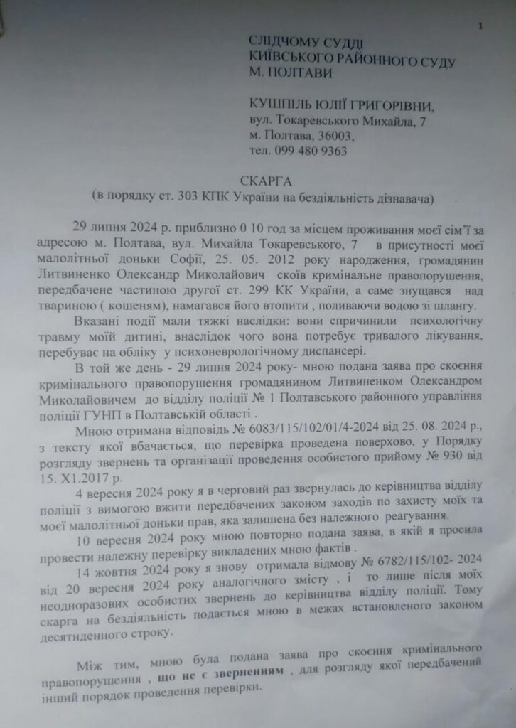 Наступного дня, після того, як нам перекинули кошеня, я пішла у справах, а моя неповнолітня дитина залишилися вдома сама. Близько 9:30 вона мені зателефонувала і почала голосно кричати у слухавку, заспокоївшись, вона пояснила, що сусід топить наше кошеня. Як виявилося, він заливав його водою зі шланги. Того ж дня я знайшла у себе на подвір’ї трьох кошенят, одне – загинуло, інших вдалося врятувати. Після таких дій сусіда довелося викликати поліцію та написати заяву.