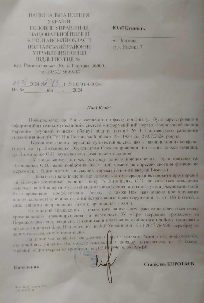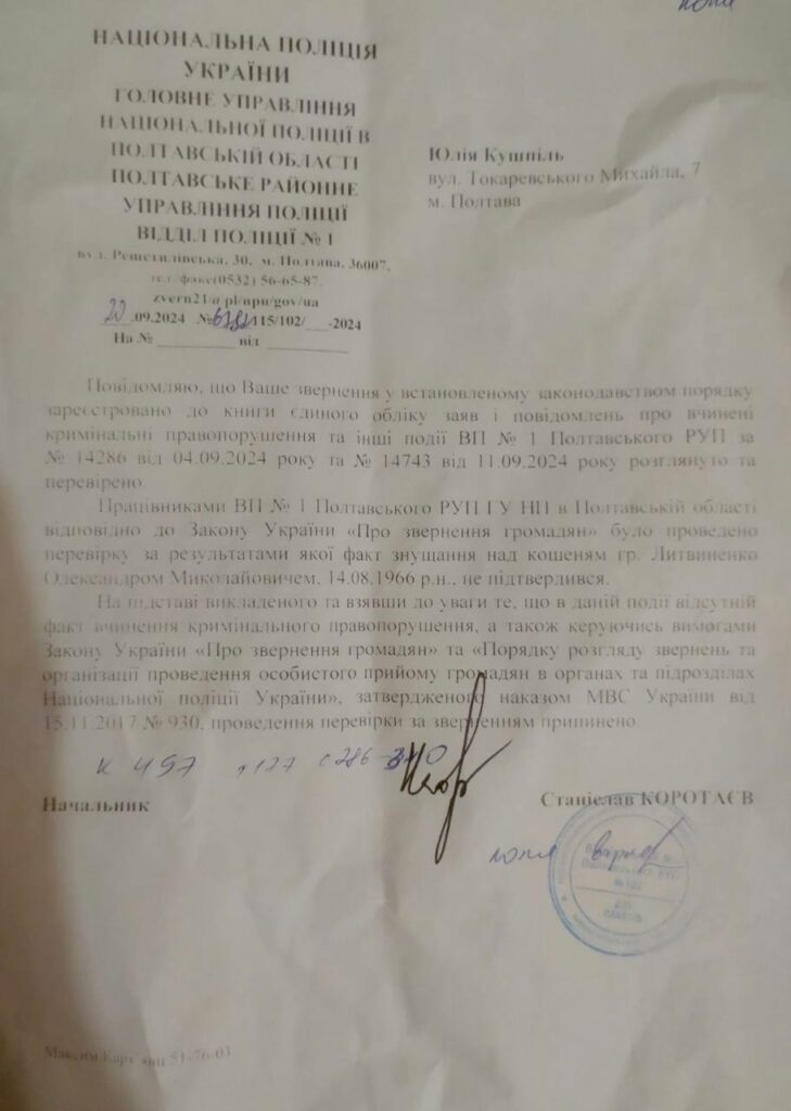 Через тиждень я звернулася до правоохоронців, аби дізнатися стан розгляду справи. Натомість мені сказали звернутися до дільничного. Спочатку він не міг знайти заяву, а потім припинив відповідати на дзвінки та повідомлення.