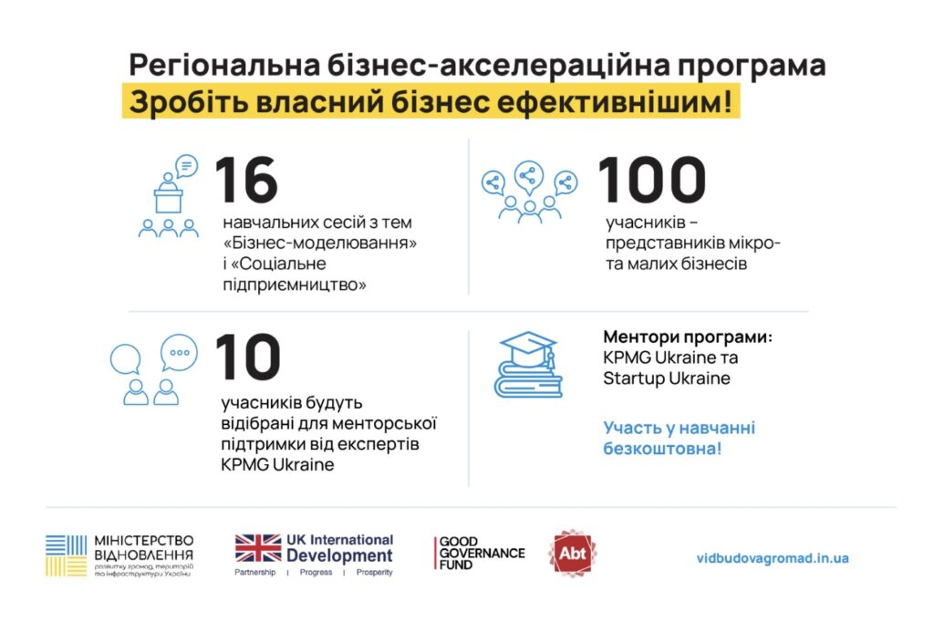 Проєкт Good Governance Fund «Регіональне відновлення», який фінансується UK International Development від уряду Великої Британії, що втілюється Abt Global та KPMG в Україні, запрошує підприємців – представників мікро- та малого бізнесу – взяти участь у регіональній бізнес-акселераційній програмі зі створення успішних бізнесів.