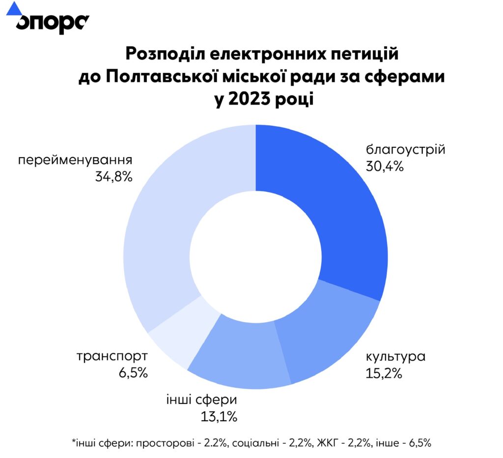 У 2023 загальна кількість петицій повернулася до рівня 2021 року. Темою №1 стало перейменування (34,8%), на другому місці опинився благоустрій — 30,4%.