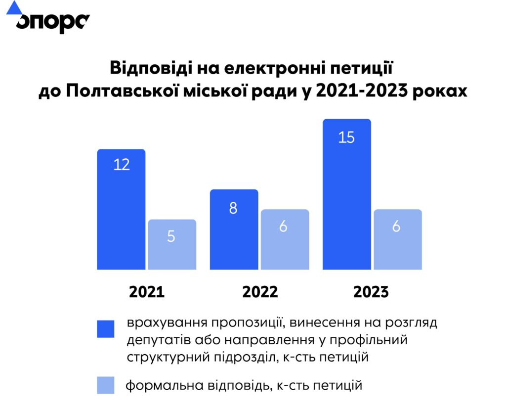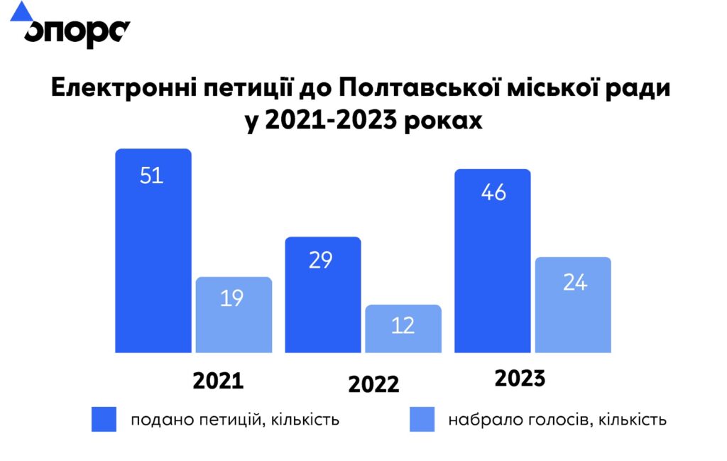 За 2021–2023 роки на сайті Полтавської міської ради було розміщено 126 петицій, з яких 55 набрали 250 і більше голосів. Це 43,6% — більше, ніж у 2020–2022 роках, коли дослідження проводив Рух ЧЕСНО. У 2023 році більше половини петицій здобули підтримку мешканців.
