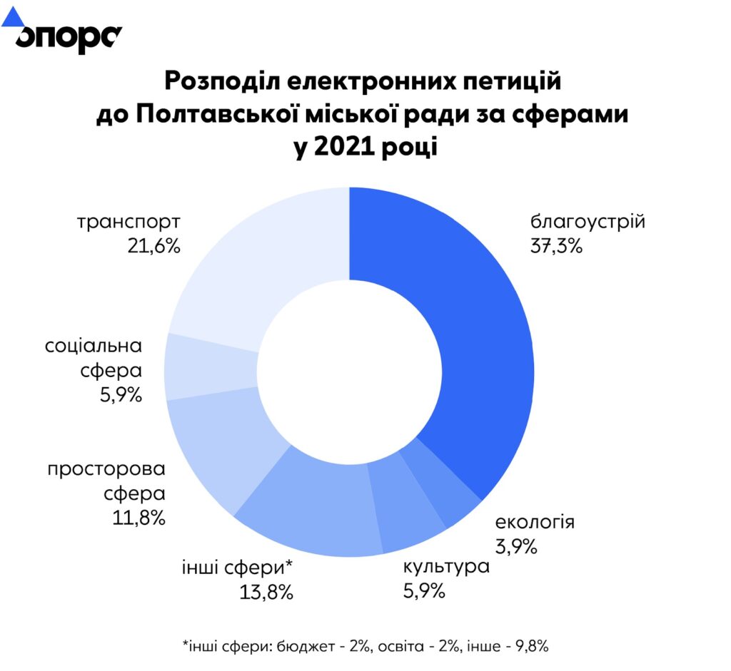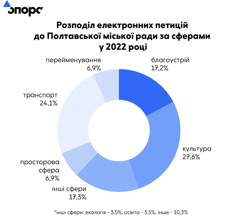 75% петицій припадають на теми благоустрою (впорядкування доріг, тротуарів, тощо), транспорту (зміна маршрутів), культури (збереження пам’яток, дерусифікація) та перейменування вулиць.