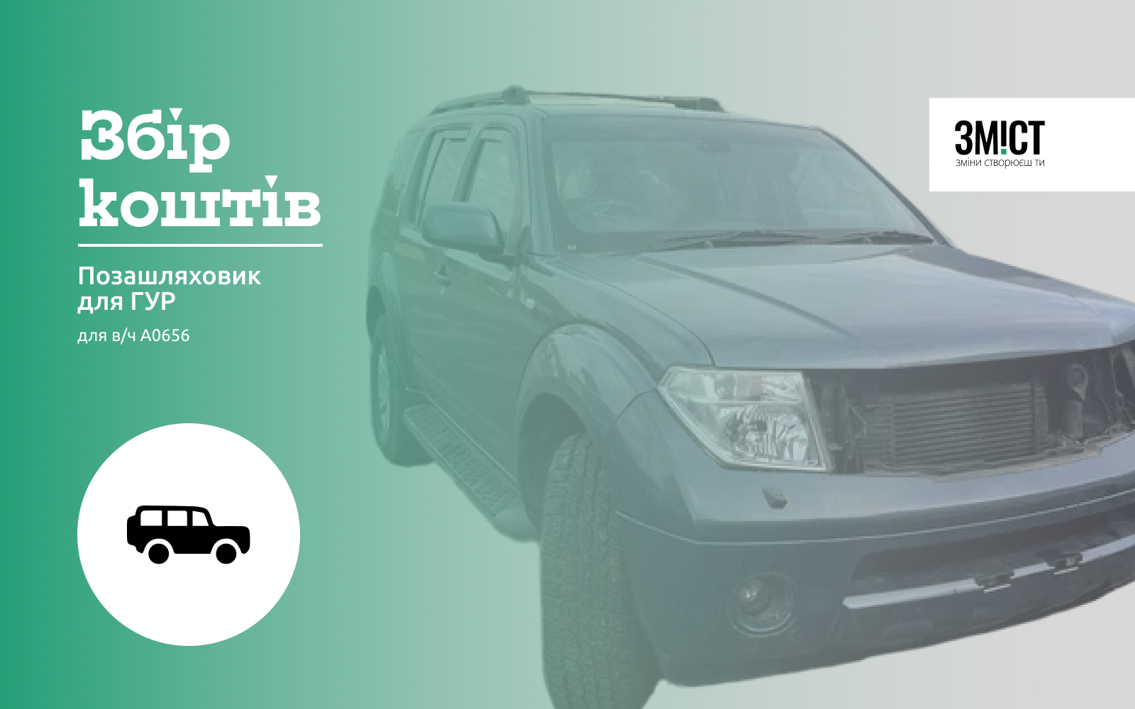 Збираємо 300 тис. грн. на автомобіль-позашляховик, щоб забезпечити військовим зручність пересування. Кинемо виклик бездоріжжю!