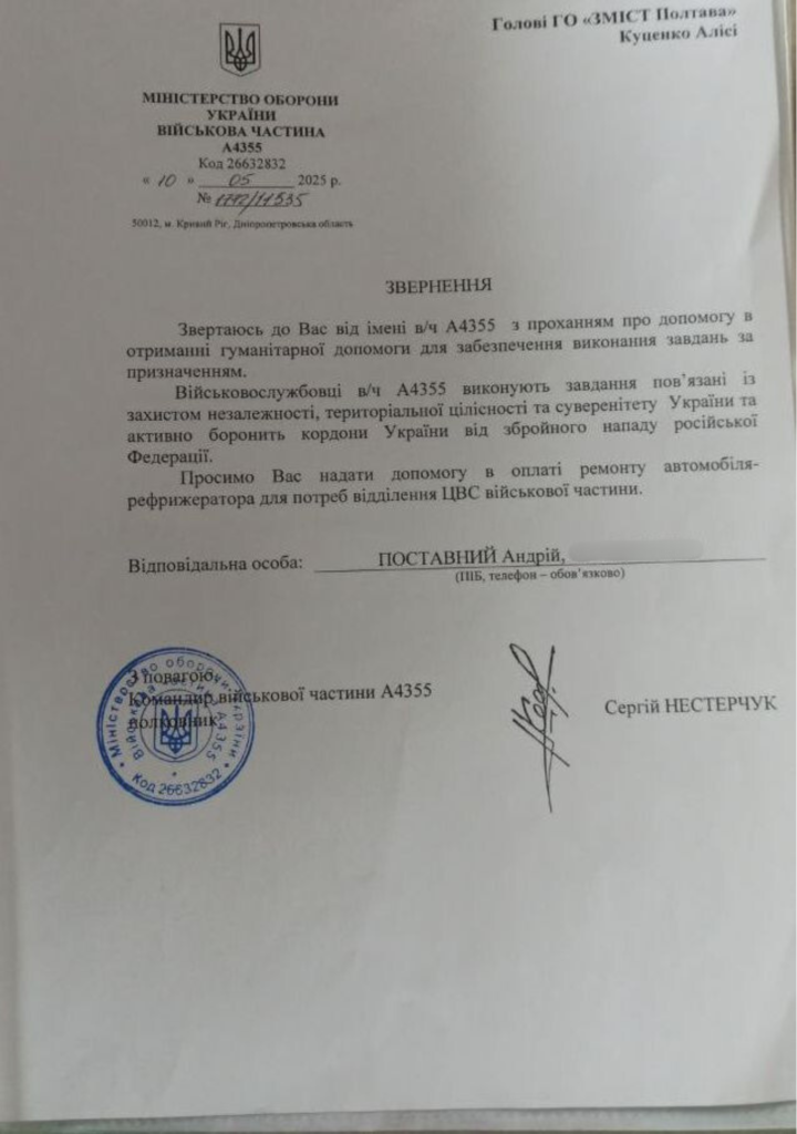 UPD. На прохання військових зібрані кошти використали для оплати ремонту автомобіля-рефрижератора для потреб відділення ЦВС військової частини. Фотозвіт незабаром.