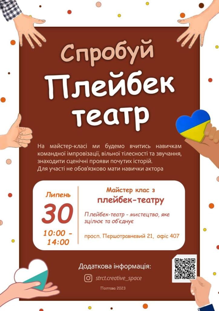 На майстер-класі ми будемо вчитись навичкам командної імпровізації, вільної тілесності та звучання, знаходити сценічні прояви почутих історій. Будемо вивчати форми плейбек-театру та емпатичне слухання. А ще ми будемо грати та отримувати задоволення, тому що гра та радість - це наріжні камені плейбек-театру. А ще дізнаємось як за допомогою плейбек-театру можна створювати акт служіння спільноті, саме цей акт і зцілює та об’єднує людей, як колись первинне мистецтво об’єднувало плем'я біля багаття.