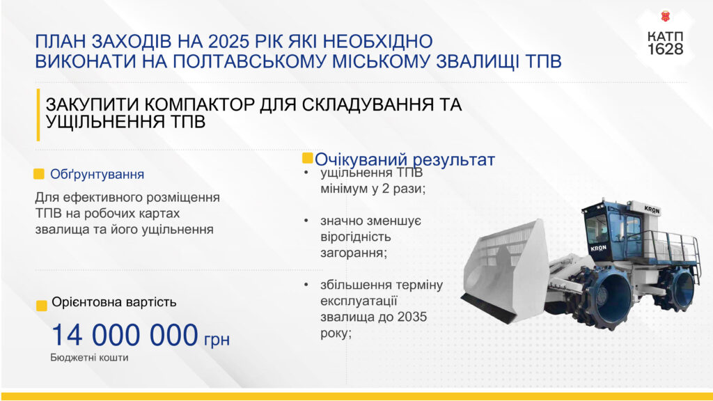 Один із головних кроків, який може продовжити життя звалища – закупівля компактора вартістю близько 14 млн грн. Машина ущільнює відходи, зменшуючи об’єм і знижуючи ризик загорянь. Очікується, що її використання дозволить продовжити експлуатацію полігону щонайменше до 2035 року.