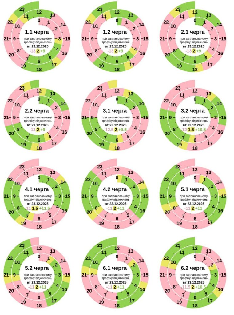 Знеструмлення охоплюють шість черг споживачів. Вони триватимуть від 2 год до 3,5 год для кожної з черг у різний час доби: