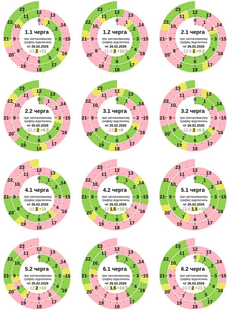 Знеструмлення охоплюють шість черг споживачів. Вони триватимуть від 2,5 год до 4 год для кожної з черг у різний час доби: