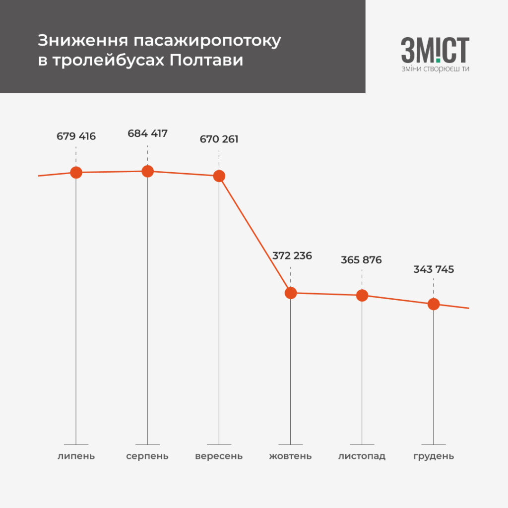 4 місяці поспіль у полтавських тролейбусах скорочується пасажиропотік (ГРАФІКА)