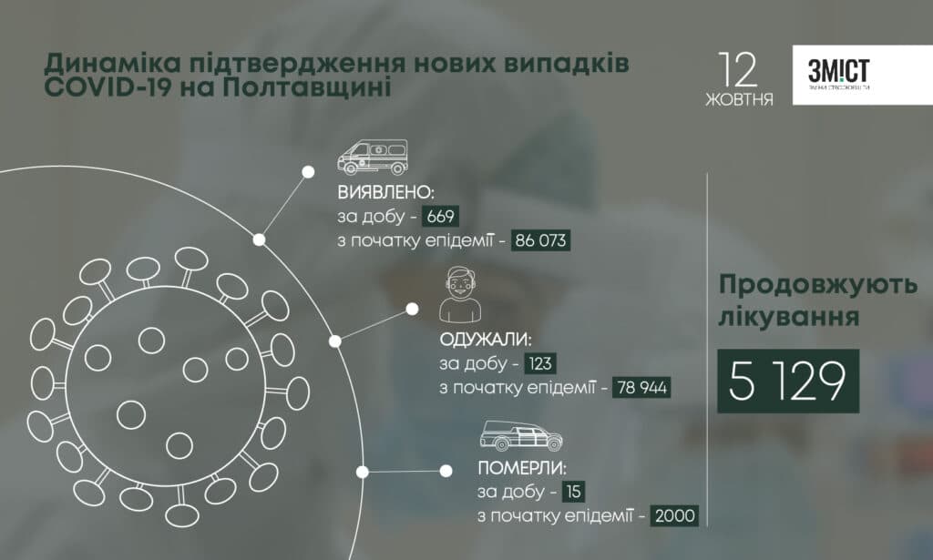 Минулої доби у 669 жителів Полтавщини підтвердили COVID-19. Одужали 123 хворих, а через ускладнення від коронавірусної хвороби померли 15 пацієнтів. Про це повідомляє Полтавський обласний центр контролю та профілактики хвороб 12 жовтня.