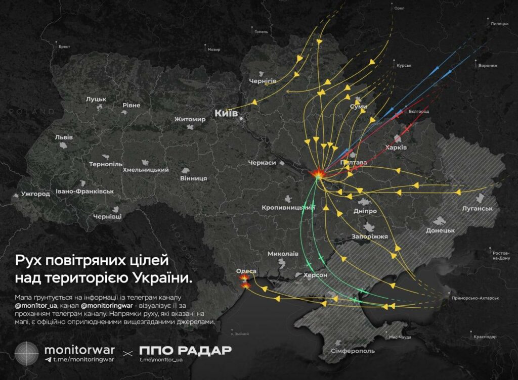 «Кременчук під масованою атакою БпЛА. Три групи 14х, 17х та 9х БпЛА у напрямку міста та агломерації», – писали OSINTери проєкту Monitor о 01:26.