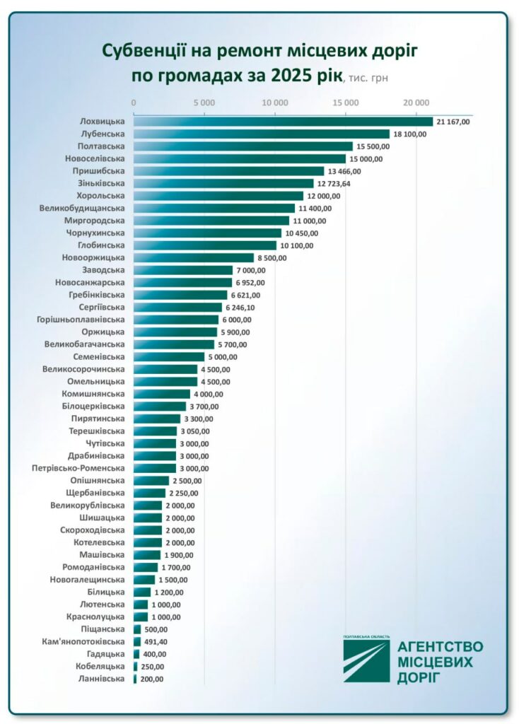 Попри те, що Державний дорожній фонд цьогоріч спрямував кошти на потреби оборони, на Полтавщині вдалося провести ремонти місцевих автошляхів. Це стало можливим завдяки спільним зусиллям державного підприємства «Агентство місцевих доріг Полтавської області» та територіальним громадам, які взяли на себе фінансування та організацію робіт. Таким чином найбільшу фінансову підтримку надали: