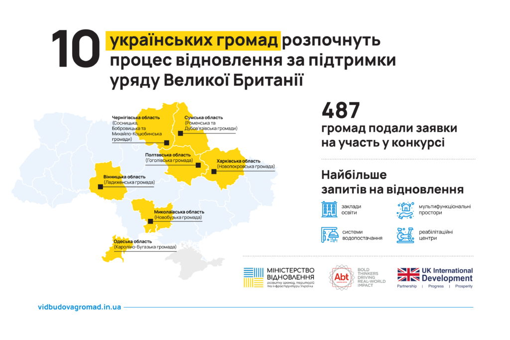За результатами конкурсу від Мінвідновлення обрали 10 громад з семи областей України. Участь у проєкті хотіли взяти 487 громад, які постраждали внаслідок російської агресії.