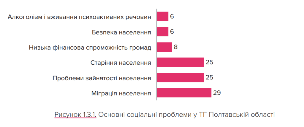 Аналіз показав, що основними соціальними проблемами, актуальними у громадах Полтавщини, є: старіння населення, безробіття, низька фінансова спроможність громад, міграція, безпека населення, алкоголізм і вживання психоактивних речовин.