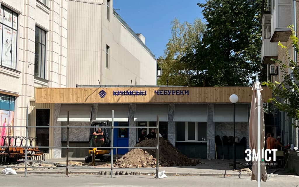 Про це повідомляє кореспондентка ЗМІСТу 22 серпня. На подвір’ї, де донедавна працювали «Кримські чебуреки», працює техніка. Майданчик готуються відділити від вулиці парканом: змонтували металевий каркас для огорожі.