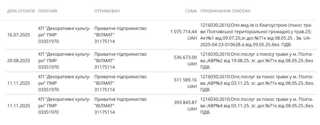 У 2025 році покіс на цих локаціях виконувала колишня туристична фірма ПП «Вілмат», при цьому оплати за виконані послуги здійснювалися переважно в липні–серпні та навіть у листопаді, що не відповідає періодам найбільшої потреби у профілактичних заходах проти кліщів, які припадають на травень–червень та вересень–жовтень.