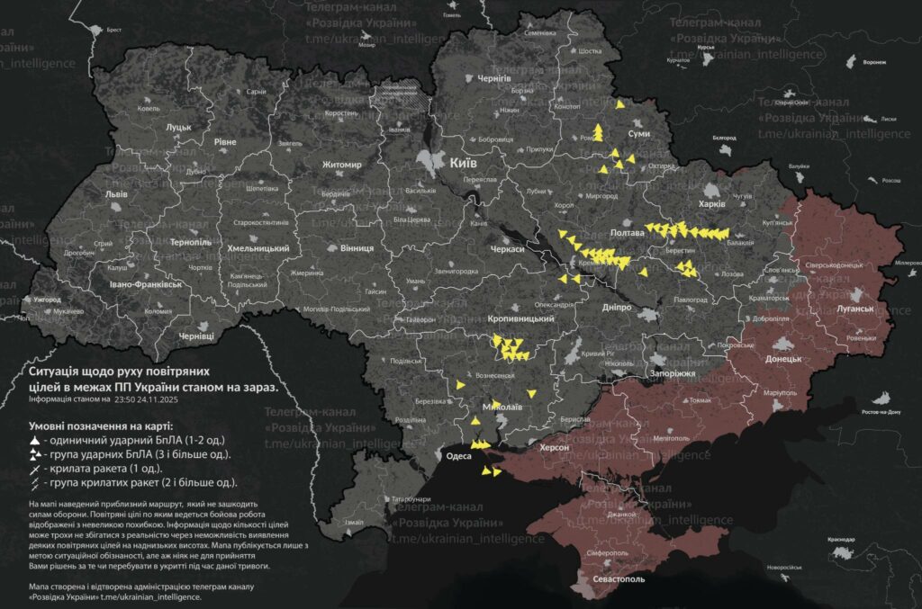 Нагадаємо, що у ніч на 25 листопада російська армія здійснила масовий запуск ракет та дронів на Україну. Військові фіксували рух безпілотників над Полтавою, Кременчуком та Кобелякам.