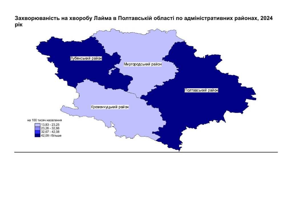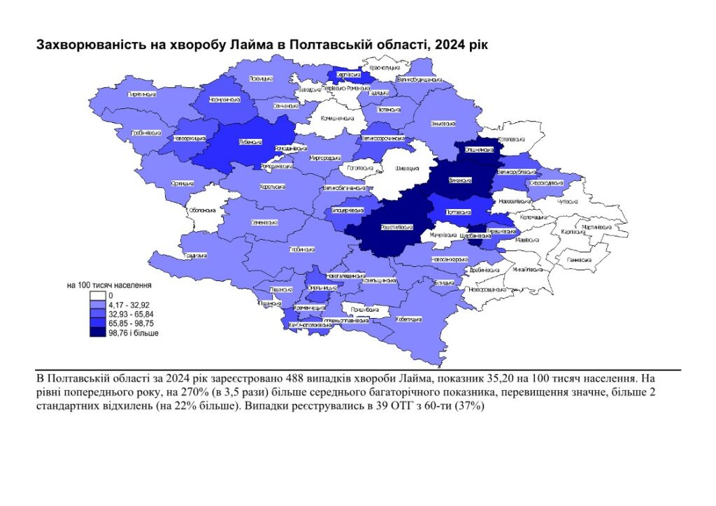 Середній показник захворюваності на бореліоз на Полтавщині становить 35,2 на 100 тисяч населення. Інфекцію виявляли у 39 громадах із 60. Найвищий показник поширеності – понад 98,76 – мають наступні громади: