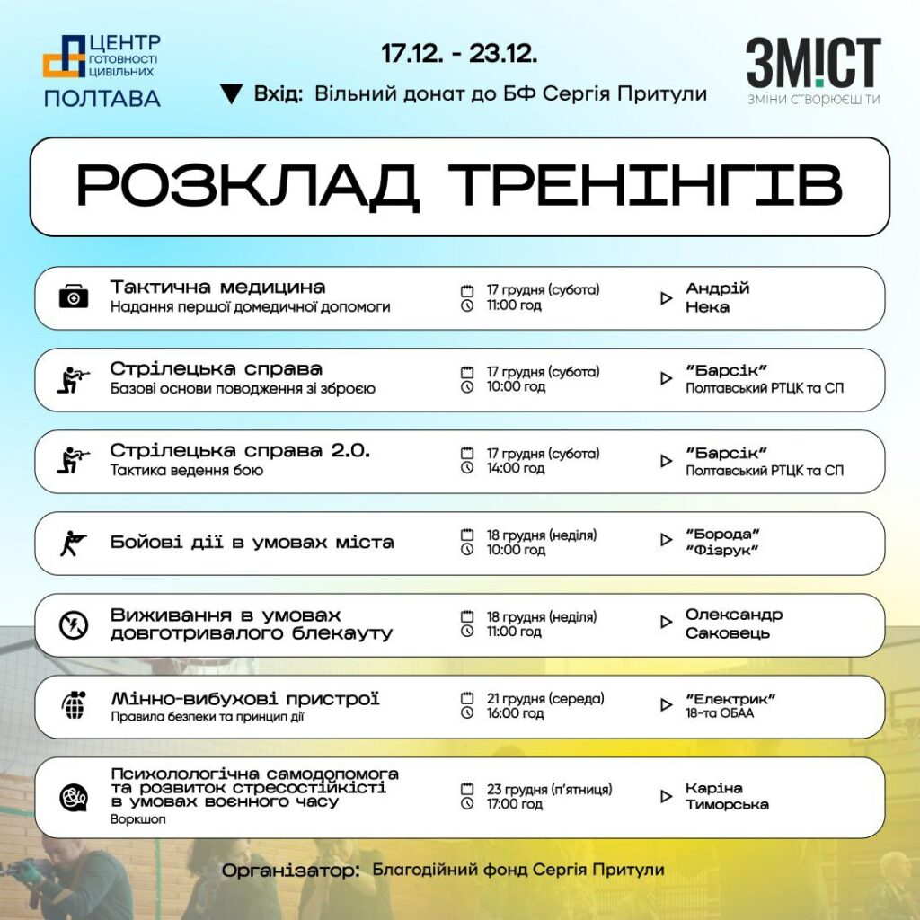 З 17 по 23 грудня «Центр готовності цивільних» підготував для полтавців 7 тренінгів. Цього разу в переліку з’явились нові теми – «Мінно-вибухові пристрої», «Психологічна самодопомога та розвиток стресостійкості в умовах воєнного часу» та «Бойові дії в умовах міста».