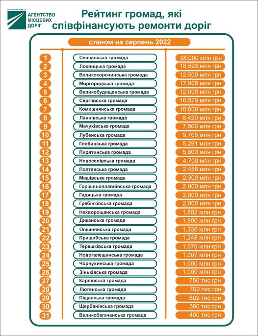 Станом на серпень 2022 року визначили ділянки та виділили найбільше коштів на ремонт доріг наступні громади: