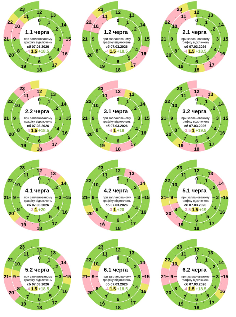 Знеструмлення охоплюють шість черг споживачів. Вони триватимуть від 1 год до 1,5 год для кожної з черг у різний час доби: