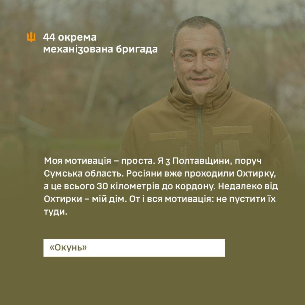 Мотивацію до служби військовий пояснює близькістю загрози. З Полтавщини до Сумської області лише кількадесят кілометрів, і на початку вторгнення росіяни вже проходили через Охтирку. Далі – рідний дім, тож головним стимулом для нього стало бажання захистити власну землю від ворога.