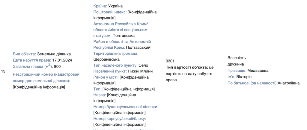 Крім цього автомобіля, Максим Медведєв задекларував Range Rover Sport, придбаний у 2023 році за 1,8 млн грн. Також відомо, що він розпочав будівництво будинку, який оформлений на дружину. Землю під будівництво площею 8 соток було придбано у 2024 році всього за 9 тисяч гривень у селі Нижні Млини.