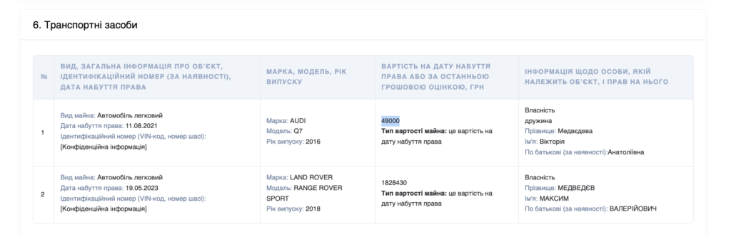 У квітні він подав виправлену декларацію. Якщо порівняти її з попередньою версією, стає зрозуміло, що його дружина Вікторія Медведєва продала своє Audi Q7 2016 року випуску, куплене, як зазначив Медведєв, за 49 тис. гривень. У продажі ТОВ «Торговий Альянс» автівку оцінили в 1 млн 435 тис. грн (майже у 30 разів дорожче, аніж воно придбане).