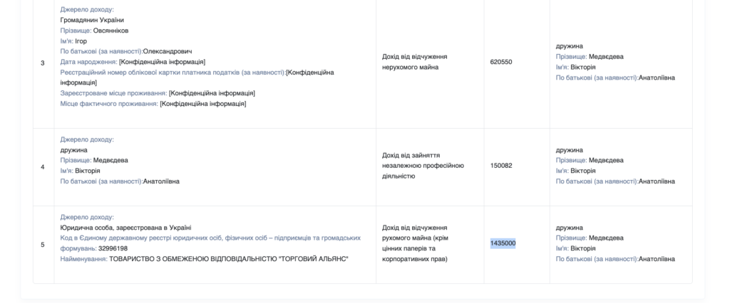 Щорічного доходу сім’ї керівника управління було недостатньо, щоб пояснити таку покупку, за умови, що заощадження – 120 тис. доларів США та 2 млн 120 тис. грн – залишилися недоторканими. У 2024 році дохід родини складався із зарплати Медведєва – 582 тис. грн, 150 тисяч гривень доходу дружини та 620 тисяч гривень від продажу нерухомості.