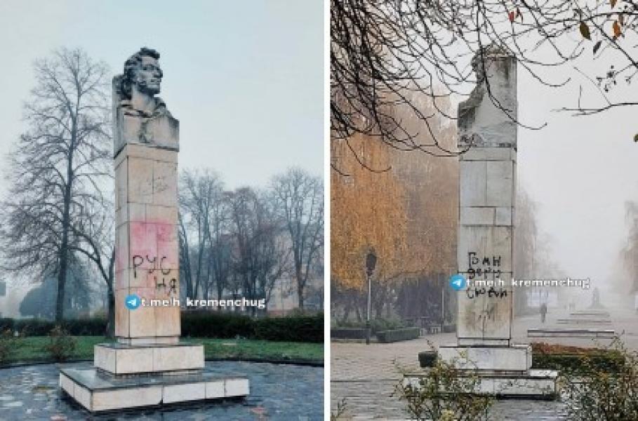 Одразу невідомі обмалювали пам’ятник Пушкіну. На монументі з’явилися слово «кат» та абревіатура ПТНХ. За кілька днів дописали слово «Русня» та інші.
