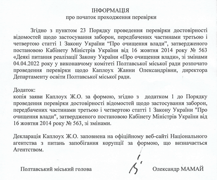 Нині триває перевірка Жанни Каплоух згідно з Законом «Про очищення влади». Вона очолила Департамент освіти Полтавської міської ради.