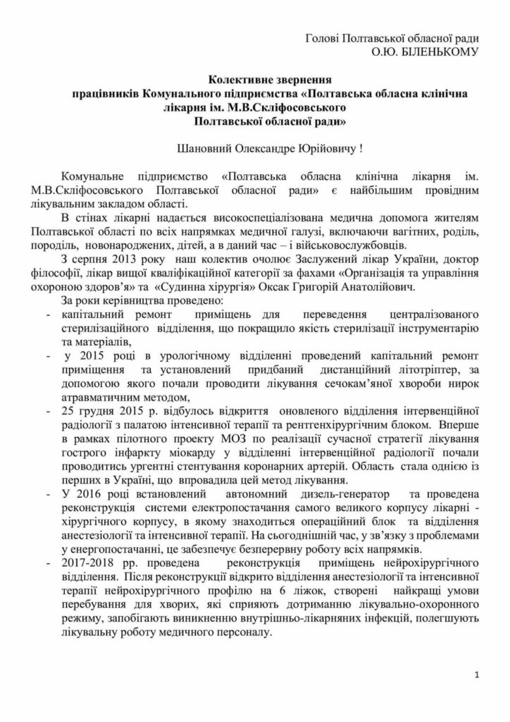 Колектив Полтавської обласної лікарні звертається до Біленького та Президента України, аби директору продовжили контракт