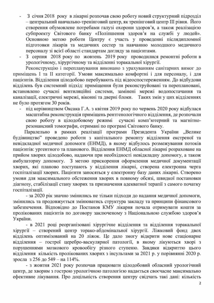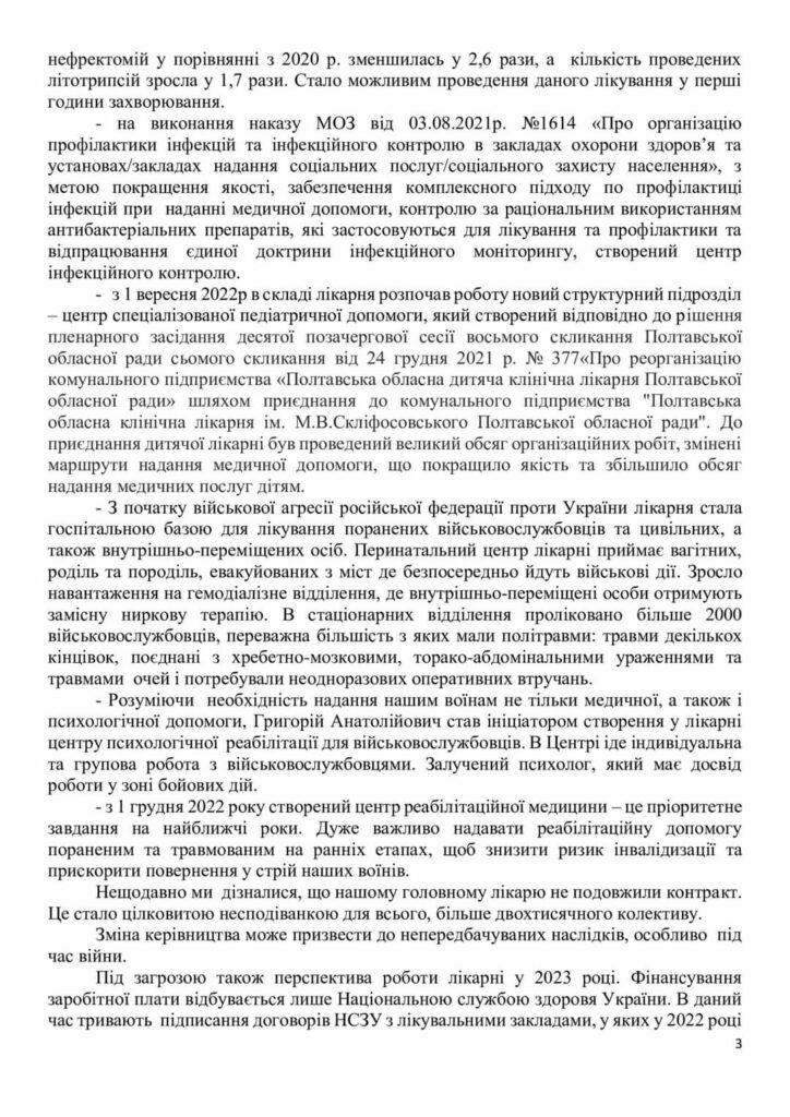 «Нещодавно ми дізналися про наміри не продовжити контракт нашому головному лікарю. Це стало цілковитою несподіванкою для всього понад двохтисячного колективу, оскільки під його керівництвом лікарня стала осередком інновацій та впровадження сучасних стандартів надання медичної допомоги, неодноразово відзначений Міністерство охорони здоров'я України та відвіданий особисто Президентом України Володимиром Зеленським».