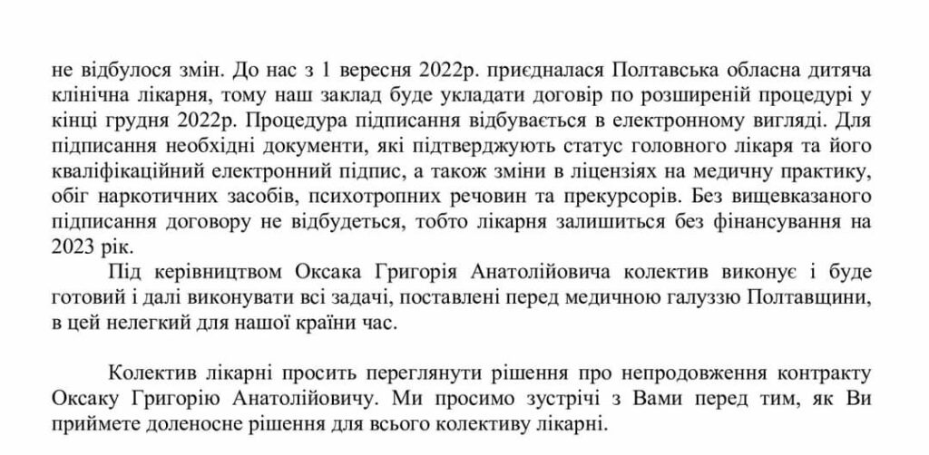 1 тисяча 200 працівників Полтавської обласної лікарні імені Скліфосовського підписали звернення проти звільнення директора медзакладу Григорія Оксака. Працівники здивовані намірами обласної влади замінити керівника у воєнний час.