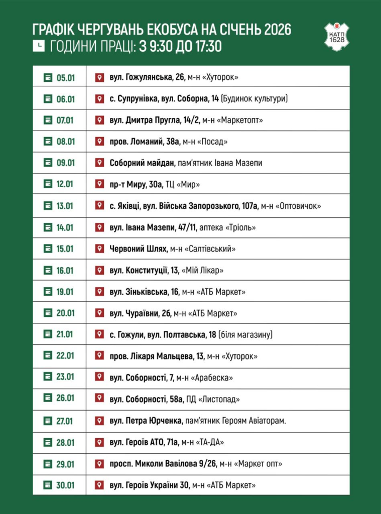 Окрім ліків, екобус продовжує приймати батарейки, лампи та ртутні термометри, акумулятори від мобільних телефонів. Графік чергувань у січні: