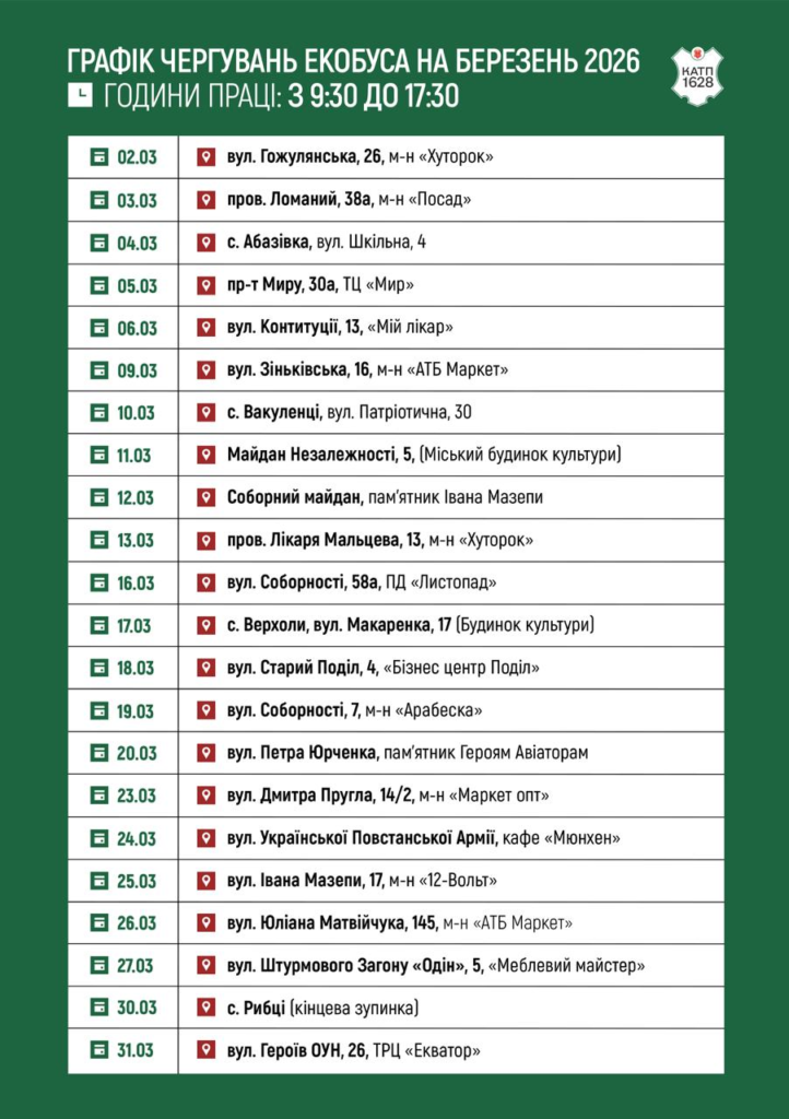 Окрім ліків, екобус продовжує приймати батарейки, лампи та ртутні термометри, акумулятори від мобільних телефонів. Графік чергувань на березень: