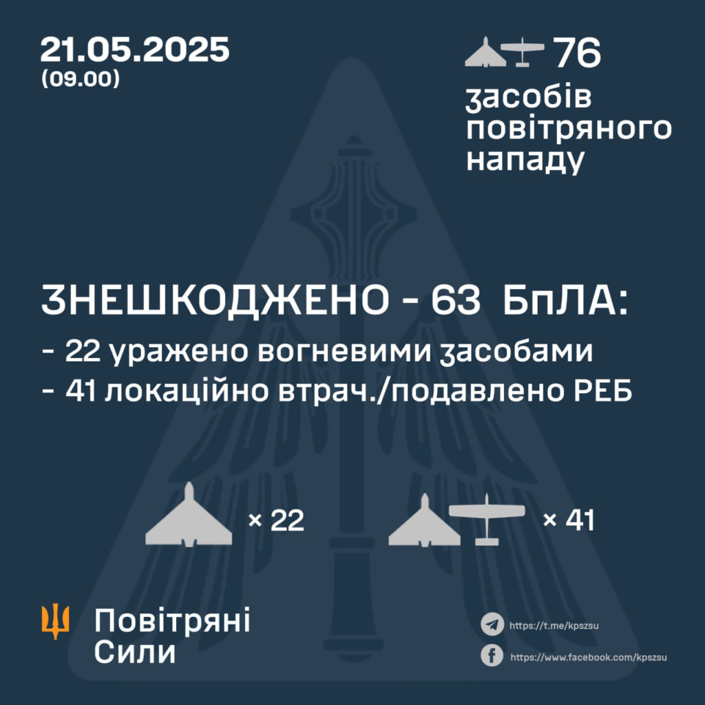 Відбій повітряної тривоги оголосили о 04:55. Як відомо зі зведення Повітряних Сил, російська армія атакувала Україну 78 ударними дронами. Загалом військовим вдалося знищити 63 повітряні цілі, ще 41 безпілотник-імітатор локаційно втратили без негативних наслідків.