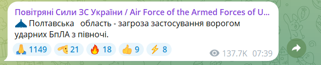 Нова хвиля атаки розпочалася зранку, коли Повітряні Сили повідомили про загрозу ударних БпЛА для Полтавщини.