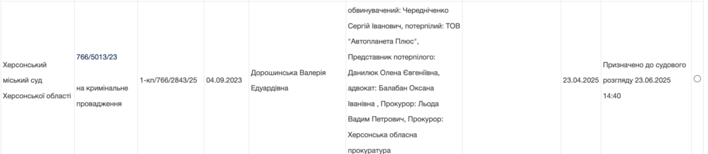 23 червня у Херсоні відбудеться судове засідання, де розглядатимуть справу про викрадення Чередніченко, як головою окупацінйого «Фонда имущества Херсонской области» автівок. Салон ТОВ «Автопланета Плюс» виступають потерпілими у справі.