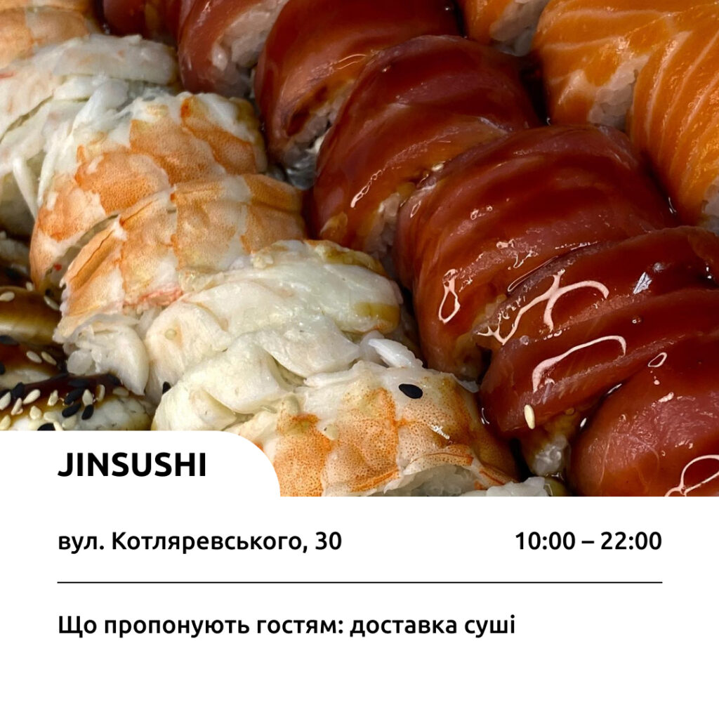 Заклад JinSushi працює щодня. Тут гості можуть замовити доставку ролів. Замовлення понад 400 грн доставлять безкоштовно. Також діє знижка на самовивіз. Дізнатися більше можна за посиланням.