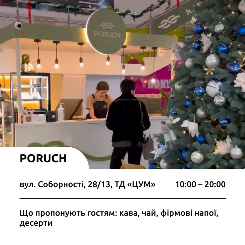 Кав’ярня Poruch знаходиться в центрі міста. Гості закладу можуть замовити каву, чай, фірмові напої. Також тут подають тістечка та торти. Дізнатися більше можна за посиланням.