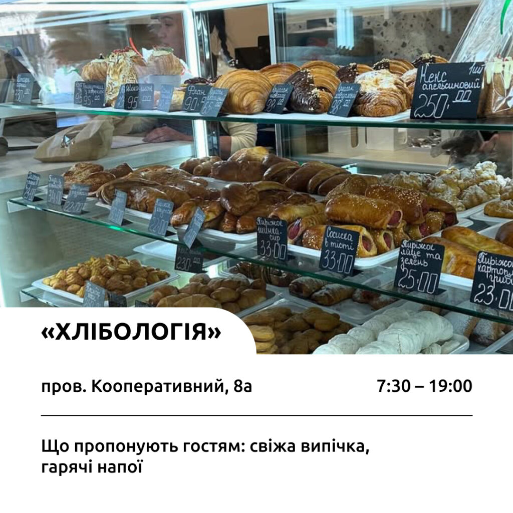 Магазин-пекарня «Хлібологія» працює щодня. Тут випікають житній, гречаний, гарбузовий та інші різновиди хлібу. Також гості можуть придбати різні десерти, пиріжки із різною начинкою тощо. Дізнатися більше можна за посиланням.