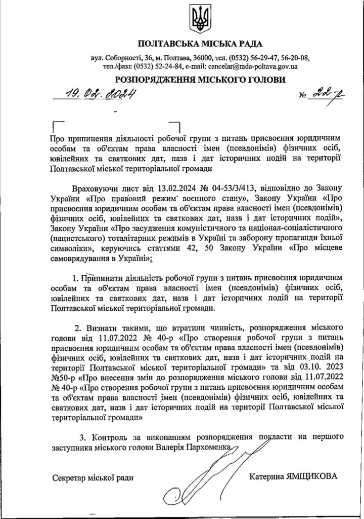 Про це відомо з розпорядження секретаря Полтавської міської ради Катерини Ямщикової. Робоча група з перейменування в Полтаві припинила працювати 19 лютого.