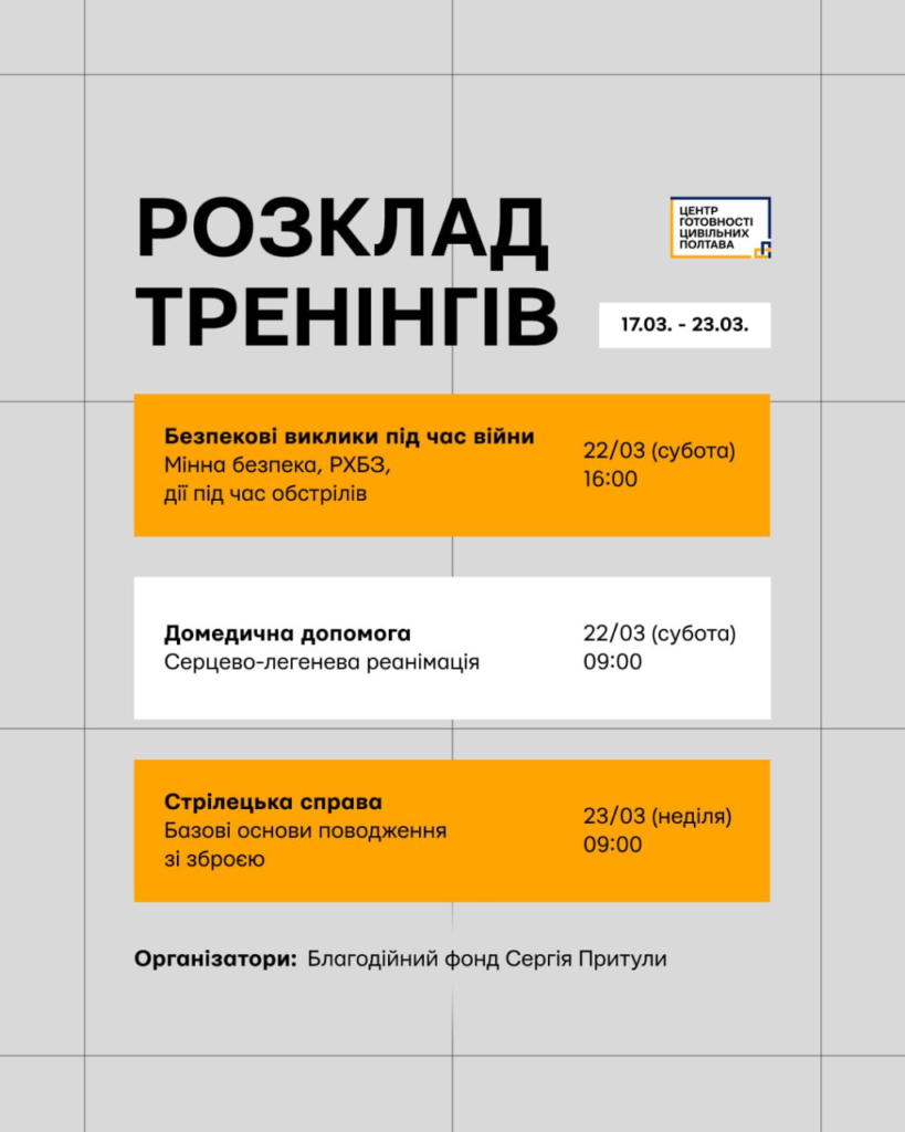 Протягом двох тижнів березня містяни зможуть покращити навички надання домедичної допомоги, а також навчаться діяти зі зброєю.