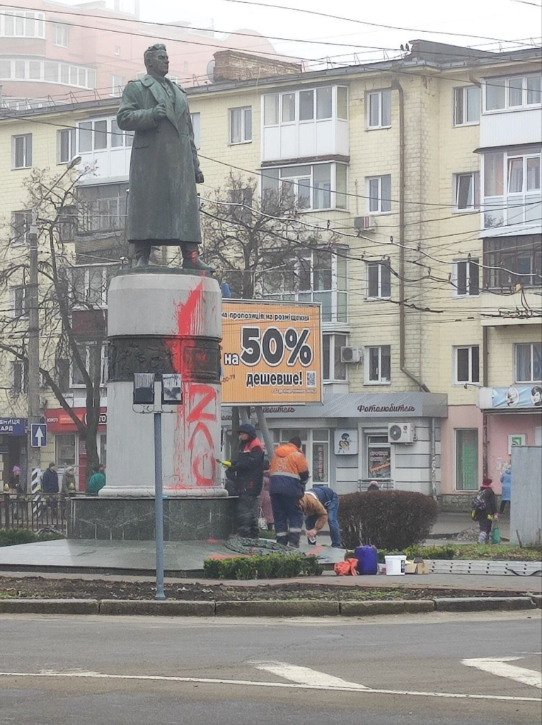 На місці зранку працювала слідчо-оперативна група, яка з’ясовувала обставини події. Також вночі облили фарбою пам'ятник Ватутіну, але, ймовірно, його теж відмиють комунальники.