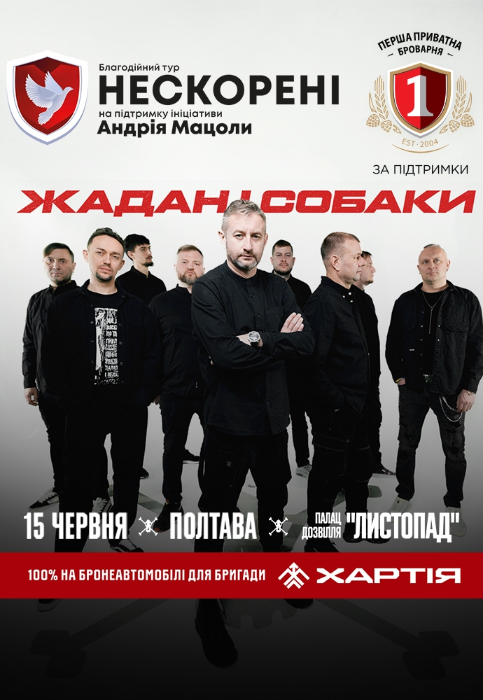 «Жадан і Собаки» повертаються з великим концертом у межах благодійного туру «Нескорені», який відбудеться на запрошення Андрія Мацоли. Завдяки партнерству з «Першою приватною броварнею» 100% коштів від продажу квитків буде спрямовано на придбання бронеавтомобілів для 13-ї бригади НГУ «Хартія».