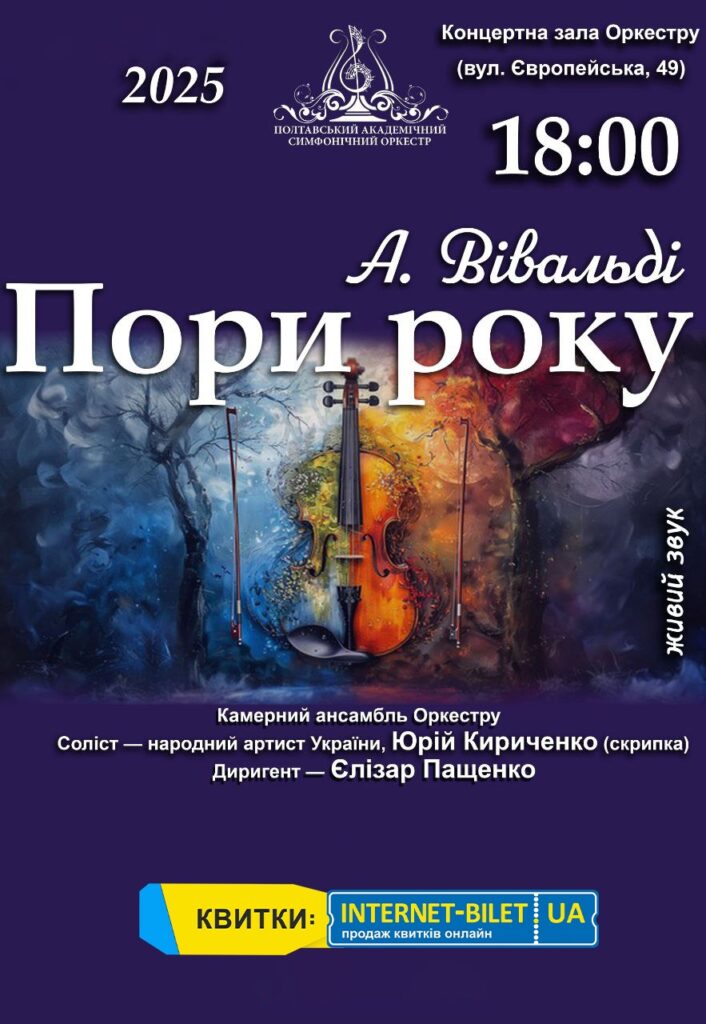 Камерний ансамбль нашого Оркестру виконає один із найвідоміших творів світової класики — «Чотири пори року». Соліст — народний артист України Юрій Кириченко (скрипка), диригент — Єлізар Пащенко, ведуча — Аліна Синяговська.