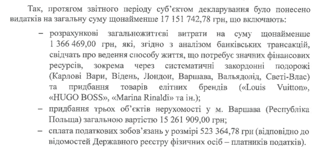 - задекларованих 8,2 млн грн заощаджень, що на майже 5 млн грн більше, ніж НАЗК встановило за підсумками аналізу.