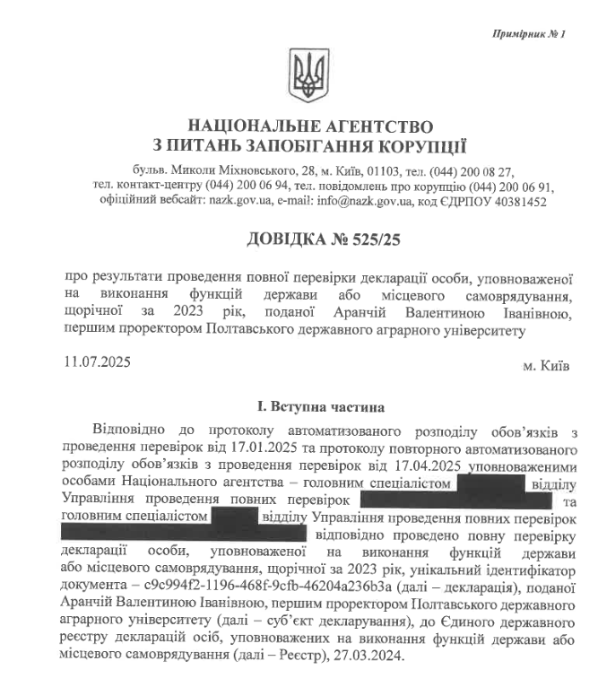 Повну перевірку декларації Валентини Аранчій за 2023 рік здійснювали в період з 20 січня по 10 липня 2025 року.