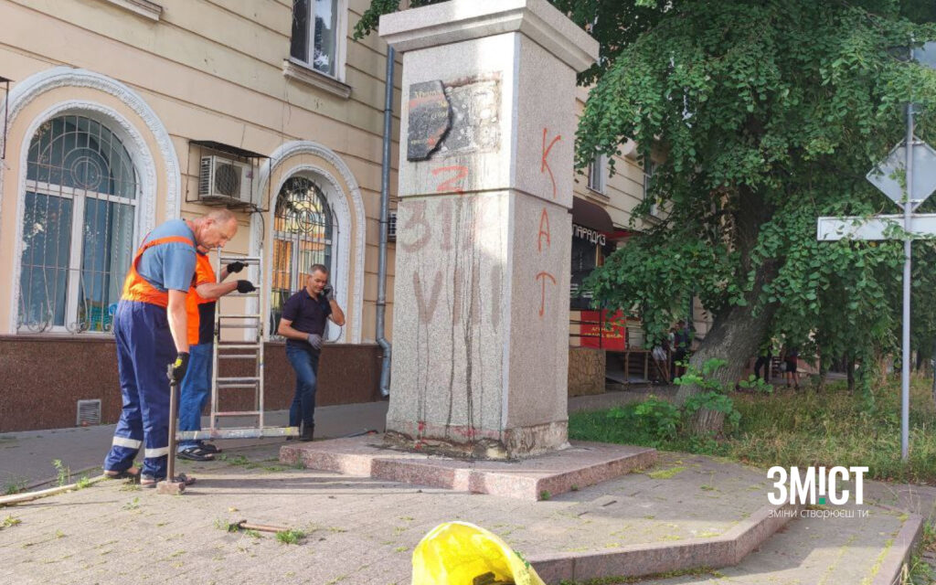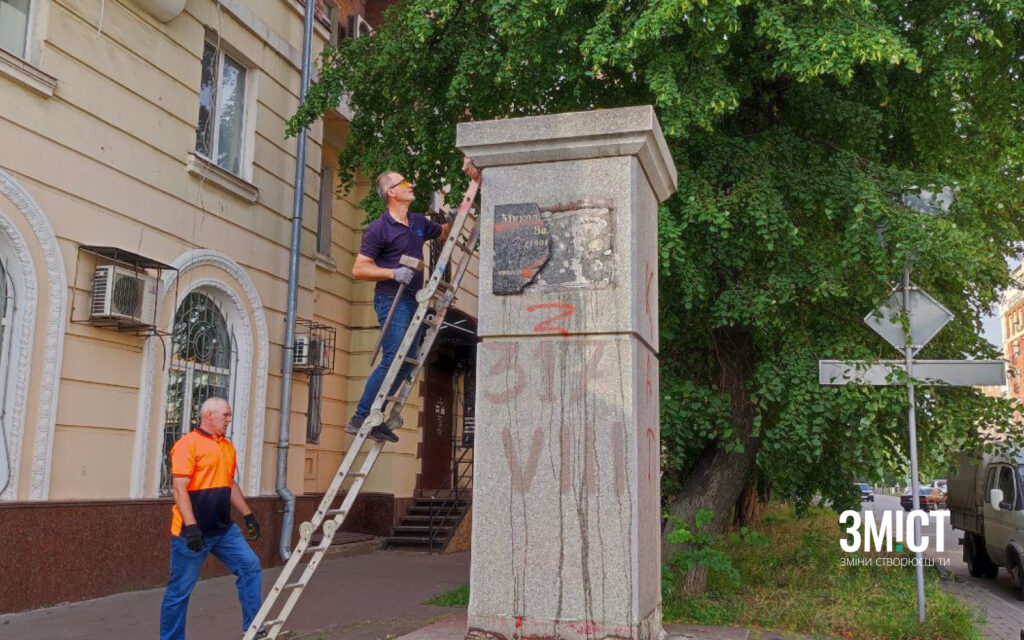 Поряд проходить чоловік поважного віку, обурливо говорить про себе. Видно, що він проти демонтажу, але уже все, монумент ставлять на автівку і починається демонтаж таблички. За кілька хвилин частина команди поїхала до Пушкіна, а інші продовжують працювати на місці.